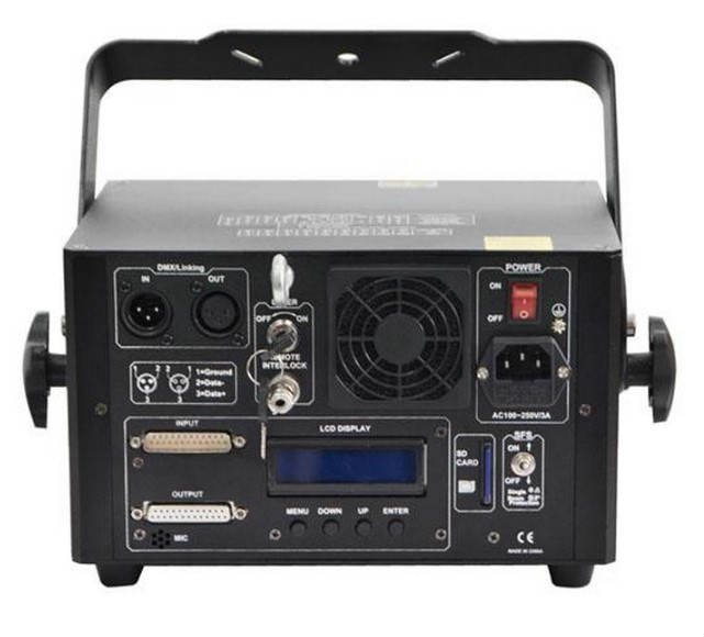 Профессиональный анимационный лазерный проектор PartyMaker AU35RGB в компактном корпусе с выходной мощностью 1600 мВт и набором лазерных эффектов. В этом многофункциональном лазере встроены такие виды эффектов, как: 2 вида 3D проекций, различные GOBO-эффекты, лучевые шоу и конечно, лазерная графическая анимация. Встроенная SD карта дает возможность работать автономно без использования компьютера. Всеми функциями можно управлять как с LCD дисплея, так и с инфракрасного пульта ДУ. Также в этом лазере используется аналоговая модуляция цвета, что дает возможность плавно менять яркость и сочетание цветов. Высокоскоростные сканнеры 25k дают возможность выводить графические объекты средней сложности без сильного мерцания. В этой модели есть стандартные порты ILDA на вход и выход, что даёт возможность работать в живую, используя любой ILDA контроллер и ноутбук. Также этим проектором можно управлять через интерфейс DMX512 (только несложные операции, такие как смена режима, выключение и тд). Что касается безопасности, то в этом приборе используется система защиты от сбоя сканнеров, которая при отказе зеркал блокирует опасный для зрения одиночный лазерный луч. Качественная сборка и надежные компоненты являются основой идеального лазерного шоу.