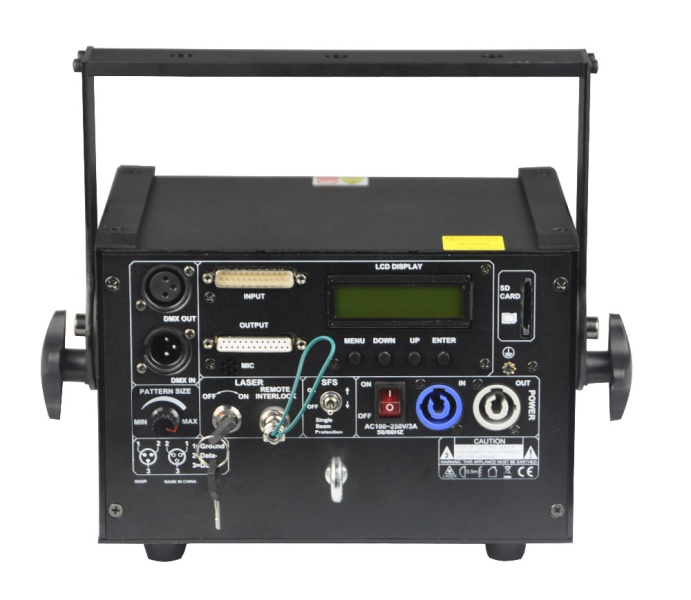 Профессиональный анимационный лазерный проектор PartyMaker AH30RGB в компактном корпусе с выходной мощностью 3250 мВт отлично подойдет для рекламных целей и для профессионального лазерного шоу на больших площадках. В этом проекторе есть поддержка карт памяти SD и графический LCD дисплей, также все управление можно осуществить с пульта ДУ (в комплекте). Отличительной особенностью этого проектора является то, что он построен полностью на лазерных диодах. Это дает преимущество в надежности, сроке службы и температуре использования. Использование зеленого лазерного диода 520 нм расширило диапазон температур работы этого лазерного проектора от -10 до +50 градусов, что очень немаловажно в различных инсталляциях. В этом лазере используется аналоговая модуляция цвета, что позволяет плавно менять яркость и сочетание цветов. Скоростные сканнеры 25k предоставляют отличные возможности для качественного лучевого шоу, а также несложной лазерной анимации. Наличие считывателя карт памяти превращает этот проектор в полностью автономную систему - Вам достаточно загрузить файлы с анимацией, бегущей строкой или логотипом на карту SD и включить нужную программу на проекторе. Никаких дополнительных подключений к внешним контроллерам или компьютеру. Но если Вам все же понадобится живое управление проектором с компьютера - в этой модели предусмотрен вход и выход ILDA интерфейса для подключению к внешнему контроллеру. Также этим проектором можно управлять через интерфейс DMX512 (только несложные операции, такие как смена анимации, выключение и тд). Что касается безопасности, то в этом приборе используется система защиты от сбоя сканнеров, которая при отказе зеркал блокирует опасный для зрения одиночный лазерный луч. Подача напряжения с использованием силового разъема Neutrik PowerCon обеспечивает надежное соединение и исключает внезапное отсоединение кабеля.