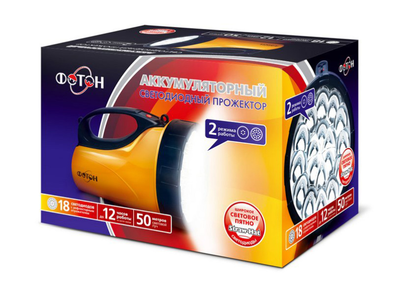 ● Аккумуляторный фонарь оснащен 18 светодиодами Straw-Hat, дающими мощный световой поток на расстояние до 50 метров.