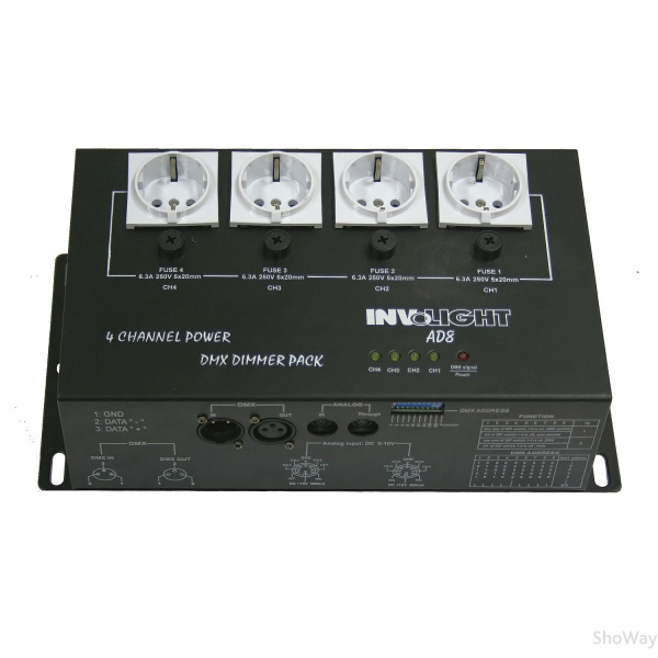 - Цифровой диммер INVOLIGHT AD8 для управления световыми приборами по средствам DMX-512. Есть аналоговое подключение. Система с 4 каналами.