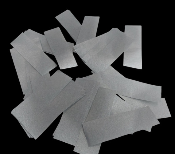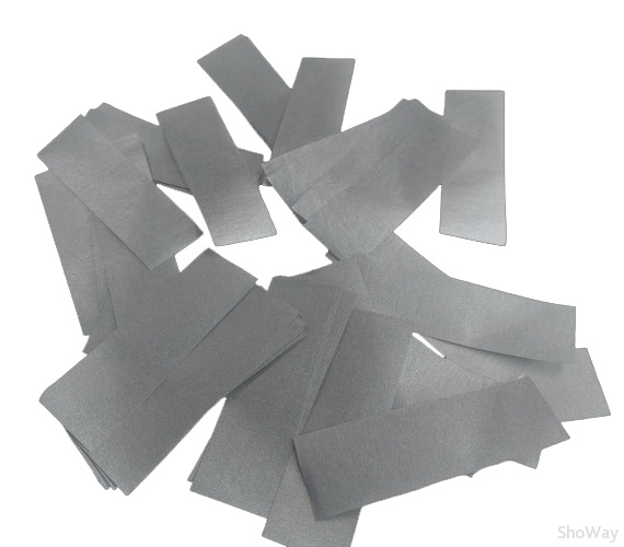 - Пожаробезопасно - изготовлено из негорящей бумаги. Бумажное конфетти сочетаются с блеском металлизированного. Есть российский сертификат пожаробезопасности. Не окрашивает поверхностей при соприкосновении с водой, размер 17х55 мм, цвет серебро