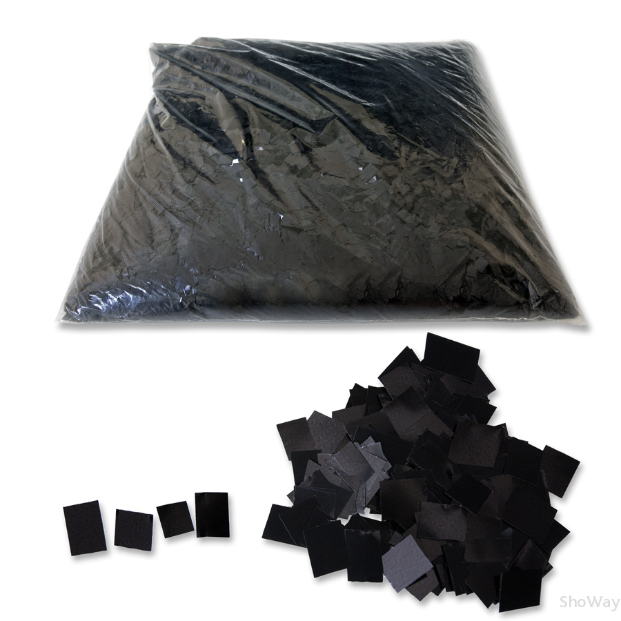 - Конфетти медленно парит в воздухе, изготовлено из ПЭТ пленки 12 мкм, окрашено с обеих сторон и имеет яркий блеск привлекающий внимание, в упаковке 1кг - 50 000 маленьких квадратиков, цвет черный