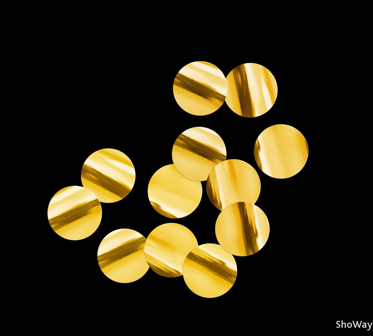 - Конфетти медленно парит в воздухе, изготовлено из ПЭТ пленки 12 мкм, окрашено с обеих сторон и имеет яркий блеск привлекающий внимание, в упаковке 1кг, яркие блестящие кружки, цвет золото