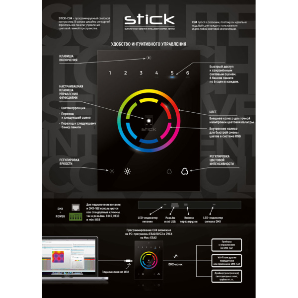 Контроллер DMX Sunlite Stick-CU4 настенный, сенсорная панель для управления световыми приборами.