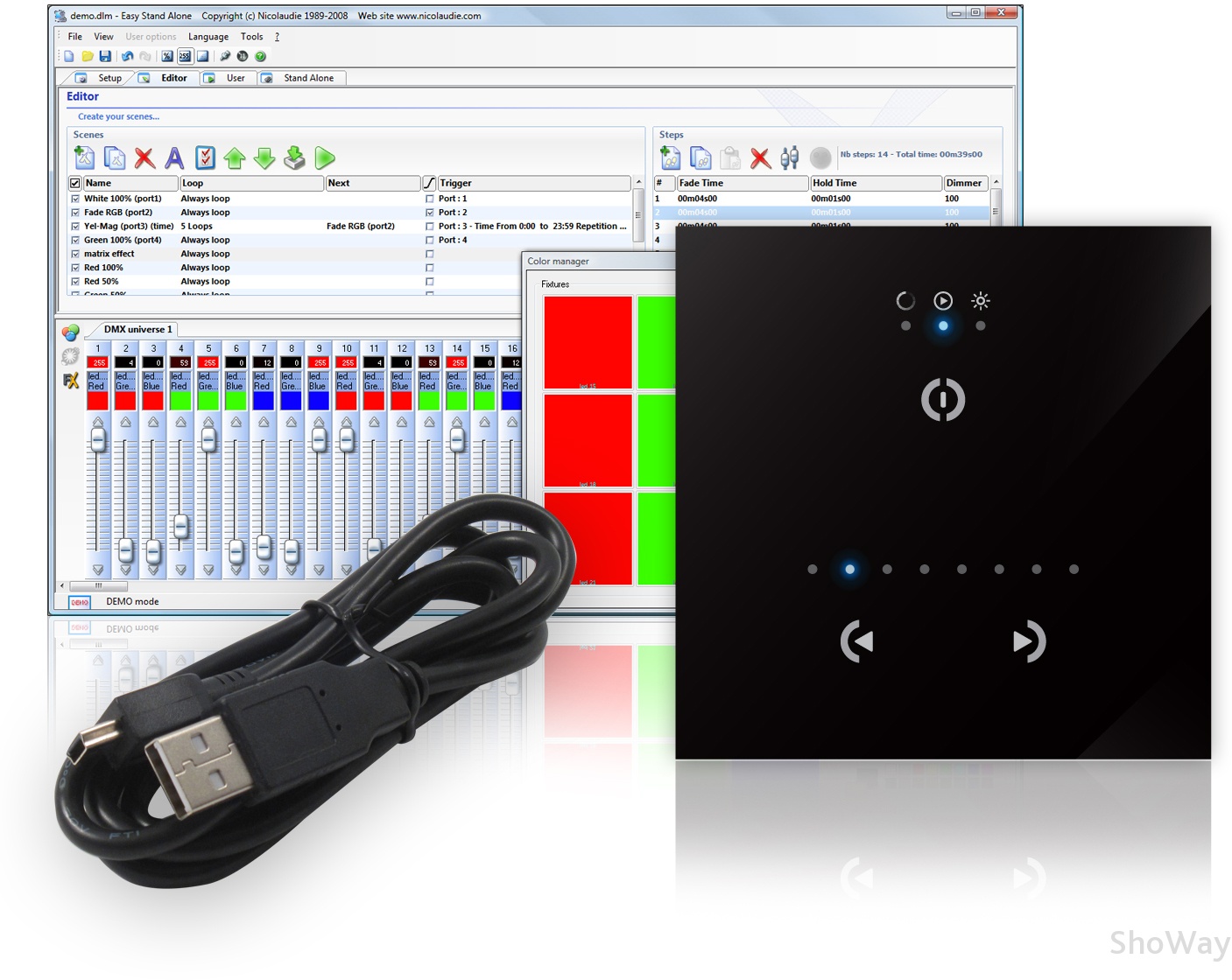 Модель Stick-GA2 Каналы DMX 128 Питание 5-12V DC 300mA Разъем USB Тип контроллер Управление Easy Stand Alone Дополнительная информация 12K объем памяти в автономном режиме Эффекты 24 сцены Светодиодный дисплей есть Цвет черный/белый Размер 86 x 86 x 11 мм Материал стекло Вес 0,13 кг Артикул 001512