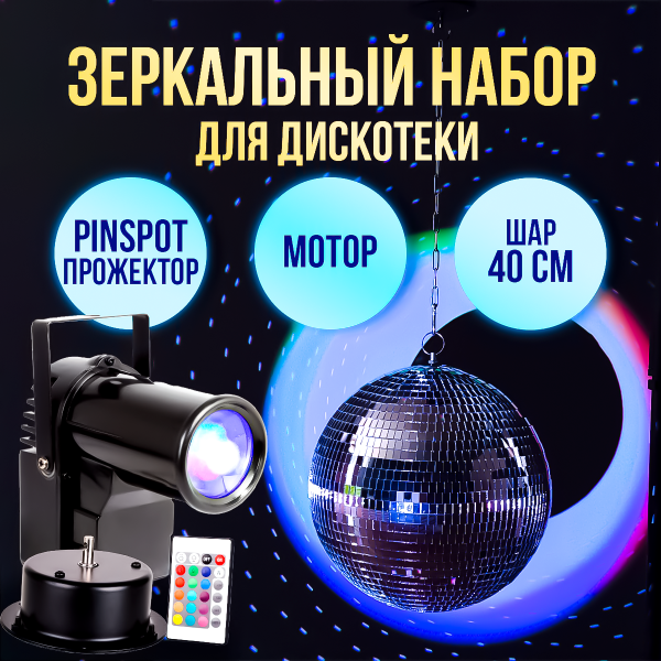 - Этот комплект придется кстати на любом праздничном мероприятии или просто на вечеринке. Разноцветный светодиодный прожектор при свечении на шар образует блики в палитре RGB создавая красивую атмосферу, а благодаря тому что в наборе поставляется мотор, то вы получите еще более приятный эффект.