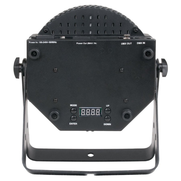 Профессиональные функции: 4 DMX-режима (каналы 6, 7, 8 и 12), 5 режимов работы, 5 кривых яркости, отсутствие мерцания и 4-кнопочное DMX-меню с цифровым дисплеем. Гирляндное объединение до 6 устройств (110 Вт) или 13 устройств (240 Вт) с помощью встроенных в устройства входных/выходных разъемов питания IEC.