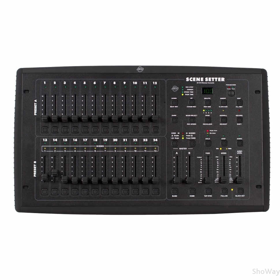 - Контроллер ADJ Scene Setter 24 имеет 48 защищенных паролем чейзов, встроенные дисплей, микрофон и кнопка управления дым-машиной. Предусмотрена возможность микширования.