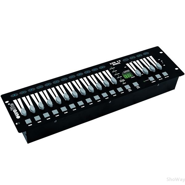 2-канальный световой контроллер EUROLITE LCD-12 DMX с управлением по DMX Может применяться в качестве DMX-контроллера или в качестве аналогового светового контроллера (12 каналов управления). 12 фейдеров со светодиодными индикаторами. Фейдер Fade Time со светодиодным индикатором для регулировки времени шага. Мастер-фейдер со .светодиодным индикатором для регулировки общего уровня выходного сигнала. Аудио-фейдер со светодиодным индикатором для регулировки уровня чувствительности к звуковому сигналу. Кнопка Flash (мгновенное включение канала на полную мощность - "вспышка") на каждом канале и master-flash (функция Full-On). Светодиодный дисплей, отображающий все режимы EUROLITE LCD-12 DMX. Выход 0/10 В выполненный на 8-контактном разъеме DIN53 встроенные программы. Диммер: Ручная регулировка с помощью канальных фейдеров. Функция Full On: все каналы могут включаться одновременно. Скорость выполнения программы устанавливается с помощью фейдера скорости или с помощью кнопки Tap Sync. Управление звуковым сигналом с помощью внешнего источника сигнала или через встроенный микрофон. Управление звуковым сигналом через разъем RCA