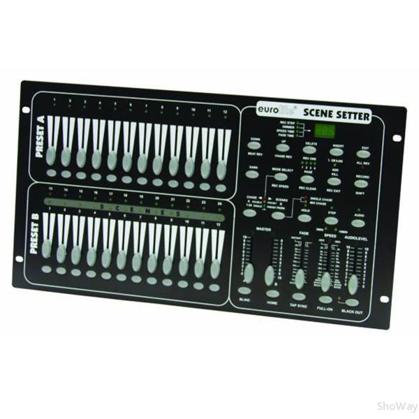 Kонтроллер DMX Eurolite Scene Setter оснащен 48 каналами управления. Имеет Память на 96 программ (4 экрана). 24 сцен могут быть вызваны непосредственно через фейдеры. Имеет blackout фунцкию. Управление звуком осуществляется с помощью встроенного микрофона или через линейный вход. Контроллер поставляется без запрограммированных чейзеров.