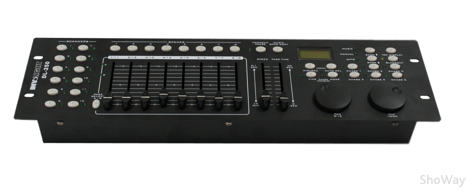 Профессиональный пульт управления световыми приборами работающими по средствам DMZ - INVOLIGHT DL250. Устройство имеет 240 канала (12 приборов по 20 каналов). Блок питания в комплекте.