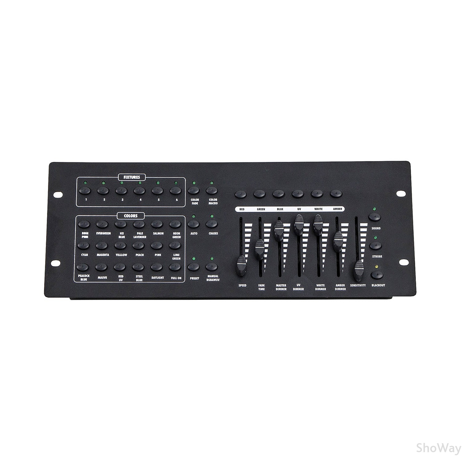 Модель DLHEX Каналы DMX 6 Напряжение DC12V 500mA Особенности Стартовые адреса: 001, 007, 013, 019, 025, 031 Комплектация встроенный микрофон, чувствительность микрофона Управление фейдеры 6, ручной, цветной, цветной, авто, чейз, строб, звук. Разъемы XLR 3-контактный (female) Эффекты 24 предопределенных, 1 свободно программируемый Размер 400x158x68 мм Вес 1,45 кг Артикул 006681