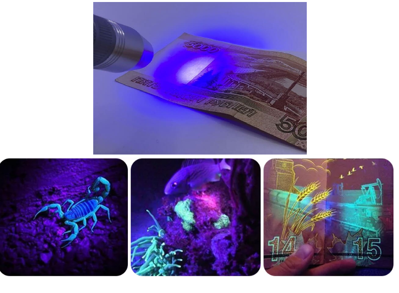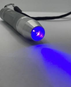 Компактный ручной аккумуляторный ультрафиолетовый фонарь с волной ультрафиолета 395 нанометр. Устройство идеально выявляет светом химические соединения, которые флуоресцируют от облучения ультрафиолетом с такой длиной волны. УФ-фонарик может использоваться для: проверки денежных купюр на подлинность за счет подсветки защитных волосков; поиска утечки антифриза в автомобиле; поиска мест утечек хладагентов в кондиционерах и холодильном оборудовании; поиска скрытой люминесцентной маркировки; обнаружения следов органических жидкостей, меток домашних животных, сушка ногтей и тд.