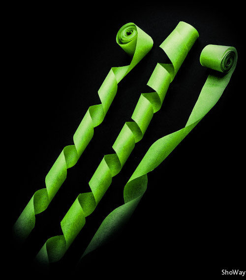 - Бумажный светло-зеленый серпантин в упаковках (20 шт.). Размер 2,5см х 20м. Пожаробезопасный, цена за упаковку