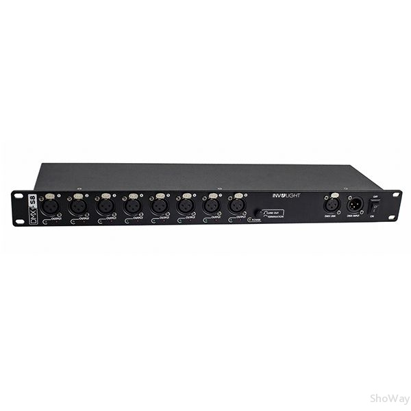 - DMX-сплиттер "DMXS8" имеет один вход и восемь выходов. Для подключения на каждый канал предлагается трех-контактный XLR разъём, который служит в качестве DMX-выхода. Каждый DMX-выход имеет независимый трансформатор. С помощью переключателя LINK-выхода возможно завершить или продолжить DMX-сигнал на другие приборы.