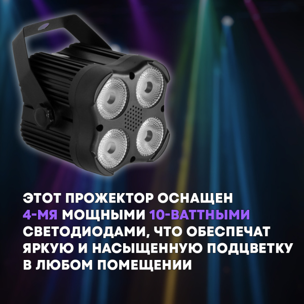 Мощные светодиоды: каждый проектор оснащён четырьмя 10-ваттными светодиодами, обеспечивающими яркую и насыщенную подсветку для любого пространства.