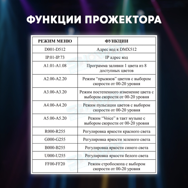 DМХ, пульт ДУ, автопрограммы или фиксированный цвет, звуковая активация