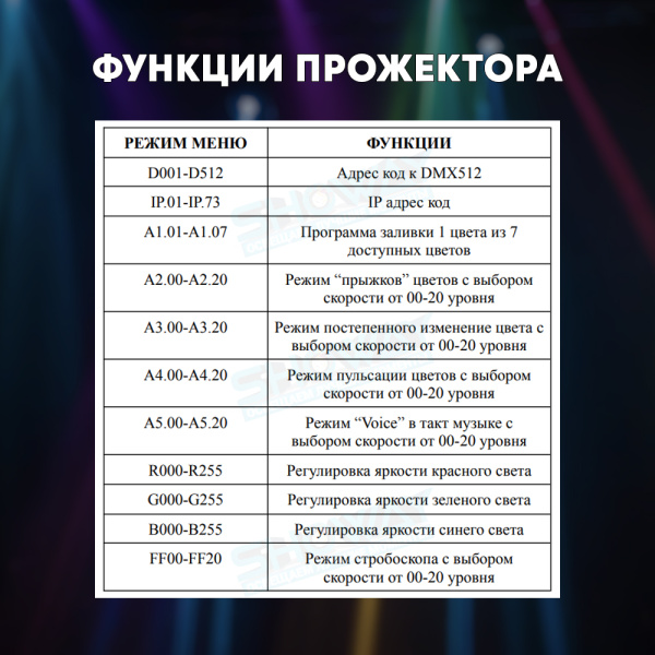 DМХ, пульт ДУ, автопрограммы или фиксированный цвет, звуковая активация
