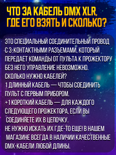 Управление: Стандартный DMX512 (отлично работает в связке с любыми DMX-пультами), Автоматический режим, Master/Slave (ведущий-ведомый).