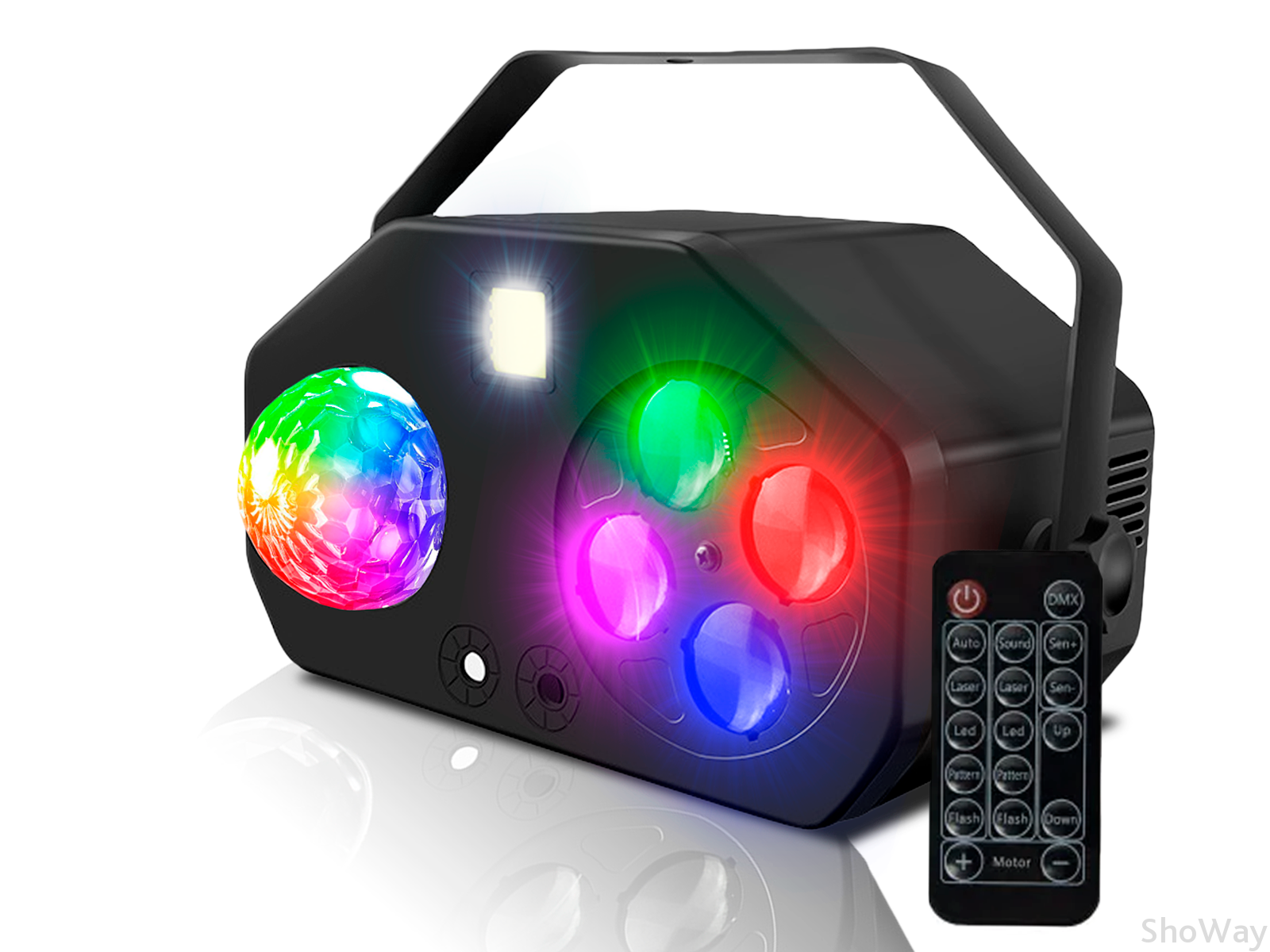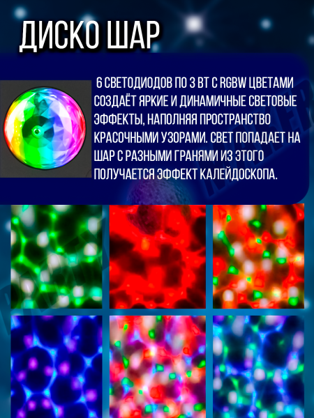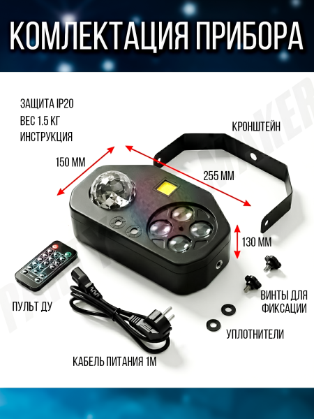 Светодиодная светомузыка 4 в 1 — это универсальное устройство, которое подойдёт для создания атмосферы на любом мероприятии. Оно сочетает в себе функции диско-шара, стробоскопа, ультрафиолетового света и лазеров, что делает его незаменимым инструментом для проведения вечеринок, свадеб, корпоративов и других торжеств.