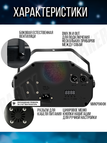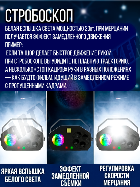 Светомузыка 4 в 1 PartyMaker 65вт, Диско шар, лазер RG, гобо-колесо, стробоскоп