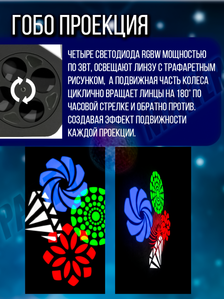 Диско шар, лазер RG, гобо-колесо, стробоскоп
