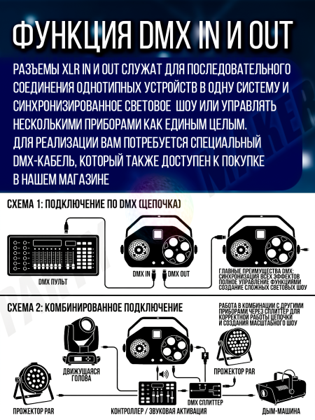 Благодаря четырём режимам работы (авто, под музыку, DMX512 и мастер/слейв) светомузыка может использоваться в различных условиях и подстраиваться под разные музыкальные стили. А пульт ДУ в комплекте делает управление еще проще.