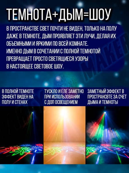 Светомузыка 4 в 1 создаёт яркие и красочные визуальные эффекты, которые сделают любое мероприятие незабываемым. Она может использоваться как основной источник света или в сочетании с другими осветительными приборами. А при сочетании с дым машиной или генератором пузырей эффект становится еще красочней.