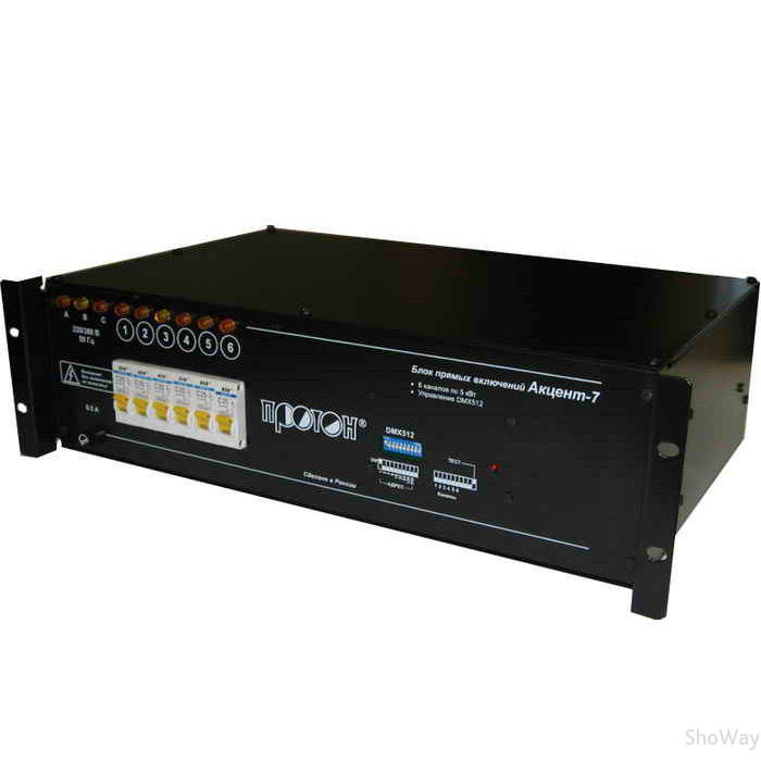 - Свитчер Proton "Акцент 7-6" 6-и DMX-канальный релейный пульт прямых включений. Предназначен для использования в качестве коммутатора в нагрузке, рассчитанной на напряжение 220В, с нагрузкой на каждый канал до 5 кВт. Удобен при работе с газоразрядными лампами.