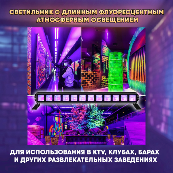 УФ-светильник мощностью 36 Вт с 40 светодиодами идеально подходит для создания атмосферного освещения. Размеры светильника составляют 400x70x46 мм, а длина флуоресцентного освещения позволяет равномерно распределить свет по помещению.
