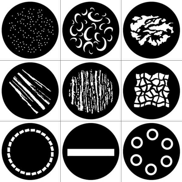 одно колесо с вращающимися гобо (Immagine Ø 26мм) и одно колесо с 8 фиксированными гобо