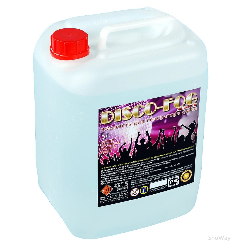 - Жидкость для генераторов дыма Disco Fog Medium обладает среднем временем рассеивания и средней плотностью дыма. В составе нет глицерина, что делает дымку без запаха, не забивает генераторы дыма и защищает от отложений внутри нагревательного элемента.