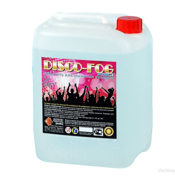 - Disco Fog Bubble - это жидкость для генератора мыльных пузырей на водной основе, предназначена для создания радужных пузырей на детских праздниках и различных шоу-программах.