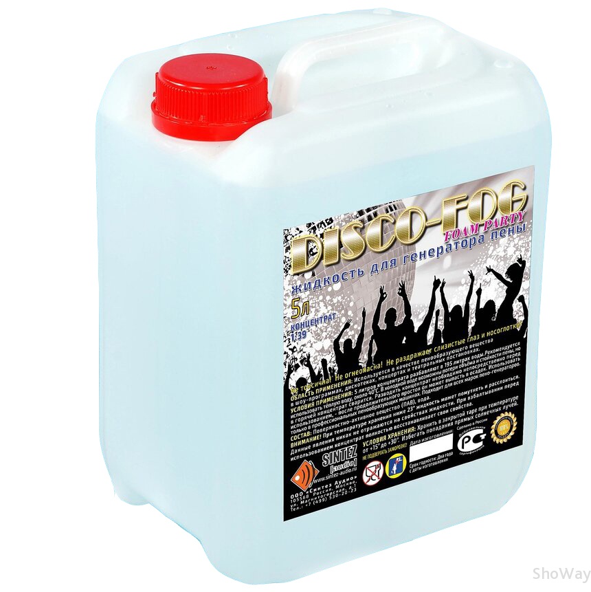 - Disco Fog Foam Party это концентрат жидкости для генераторов пены, который размешивается с водой в пропорциях 1 на 49. С 5-литровой канистры получается 200 литров готовой жидкости для пенной вечеринки.