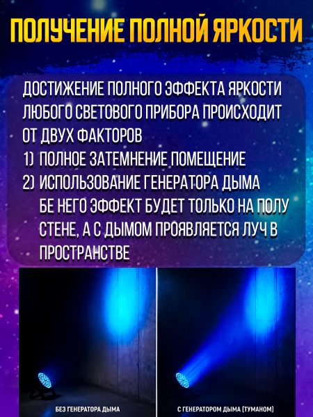 Это базовая и абсолютно необходимая вещь для любого светового сетапа. Отлично справляется с архитектурной подсветкой стен (аплайтинг), фоновой заливкой сцены, танцпола, фотозон или витрин. Дает плотный, яркий луч и позволяет получить практически любой цветовой оттенок за счет плавного смешивания красного, зеленого и синего цветов.