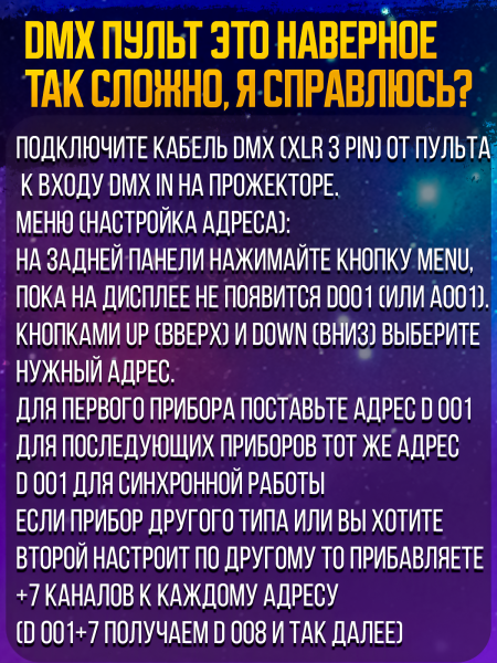 Управление: Стандартный DMX512 (отлично работает в связке с любыми DMX-пультами), Автоматический режим, Master/Slave (ведущий-ведомый).
