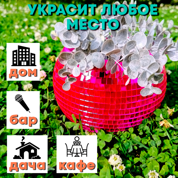 Это кашпо предоставляет вам безграничные возможности для декорирования. Высадите в него свои любимые цветы или растения, создавая живые и яркие композиции. Кашпо в виде диско шара станет отличным украшением для вашего сада, балкона, террасы, а также для интерьера гостиной или кухни.