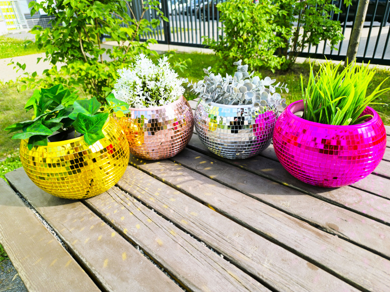Это кашпо предоставляет вам безграничные возможности для декорирования. Высадите в него свои любимые цветы или растения, создавая живые и яркие композиции. Кашпо в виде диско шара станет отличным украшением для вашего сада, балкона, террасы, а также для интерьера гостиной или кухни.