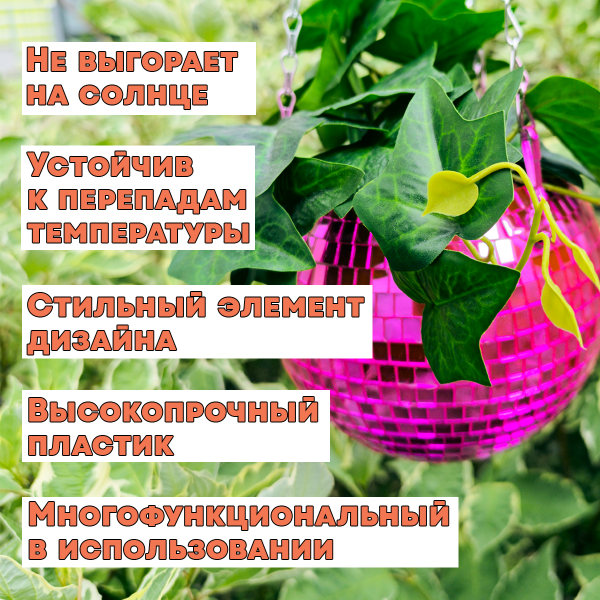Это кашпо предоставляет вам безграничные возможности для декорирования. Высадите в него свои любимые цветы или растения, создавая живые и яркие композиции. Подвесное пластиковое кашпо в виде диско шара станет отличным украшением для вашего сада, балкона, террасы, а также для интерьера гостиной или кухни.